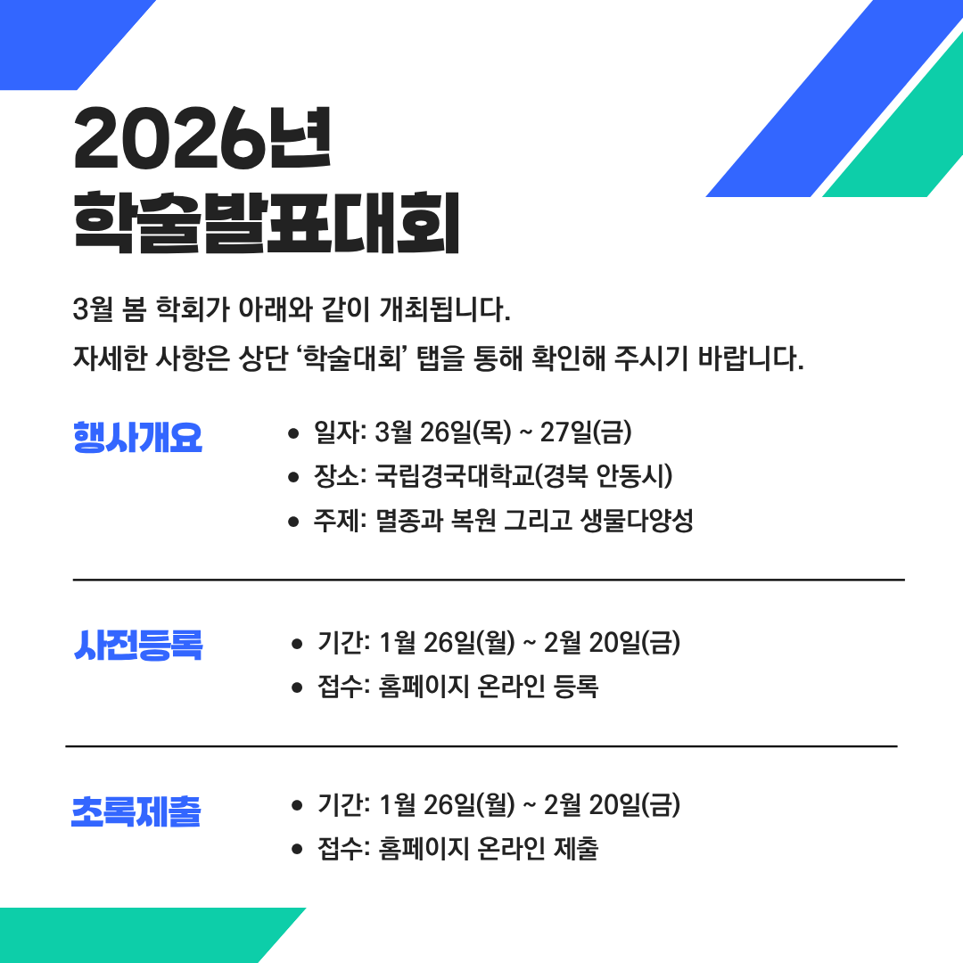 ¿ì¸® ÇмúÁö´Â µ¿¾Æ½Ã¾Æ»ýÅÂÇÐȸ(EAFES)ÀÇ ÀÎÁõÀ» ¹ÞÀº ÇмúÁö·Î, 2013³âºÎÅÍ Scopus¿¡ µîÀçµÇ¾î ¿Ô½À´Ï´Ù.
